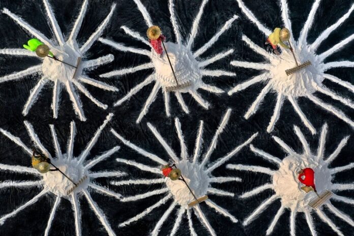 Trabajadores mueven la sal para formar líneas circulares, permitiendo una lenta evaporación al sol, una práctica que no ha cambiado desde los tiempos en que Ghandi organizó “La marcha de la sal” para denunciar el monopolio británico que explotaba estas minas en la costa del mar Arábigo. En 1930, el líder del movimiento de emancipación de la India recorrió junto a cientos de seguidores 400km, desde su retiro en Sabermanti hasta Danda, sin un atisbo de violencia, y al llegar al mar, el 6 de abril de 1930, se agachó y recogió un puñado de sal. Su gesto simbólico fue replicado por todo el país, desafiando las leyes británicas que los obligaba a pagar un impuesto por su utilización. Gandhi y otros 60.000 indios fueron arrestados. Meses después recuperaron su libertad, cuando el virrey reconoció el derecho de los indios a explotar sus recursos. Pero todavía habrían de pasar 18 años para que la India lograse su independencia.