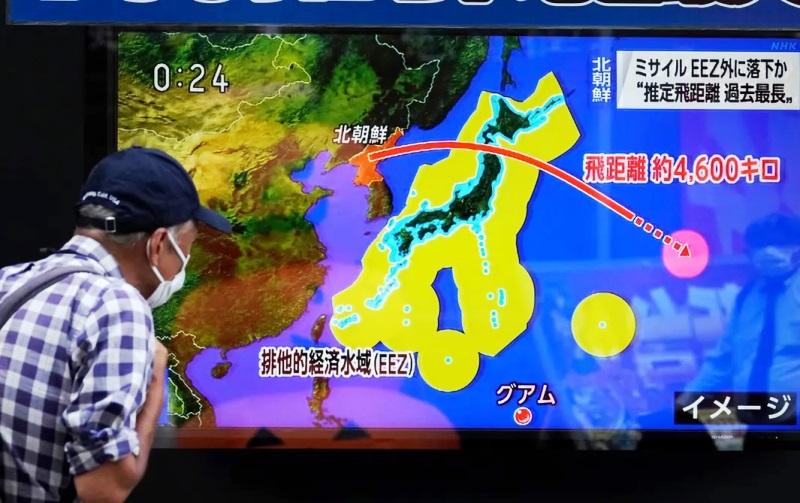 Un peatón se detiene para ver una pantalla en las calles de Tokio que muestra la noticia del lanzamiento de un misil balístico de Corea del Norte sobre Japón, que aterrizó en el Océano Pacífico. El misil surcó el norte de Japón para caer a 3.000km de la costa. El gobierno japonés activó el martes su sistema J-Alert para los residentes de la prefectura de Aomori quienes evacuaron los edificios y se refugiaron en subsuelos, al tiempo que los servicios de trenes se detuvieron temporalmente. Oriente asiste a la escalada bélica más importante de los últimos 50 años, con patrullajes conjuntos de naves rusas y chinas en el estrecho de Taiwán, pruebas de armas del régimen de Kim Jong-un y visitas frecuentes de autoridades estadounidense a la región, como la de la vicepresidenta Kamala Harris quien la semana pasada anunció en Japón que su país “seguirá operando sin temores por donde lo permitan las leyes internacionales”.