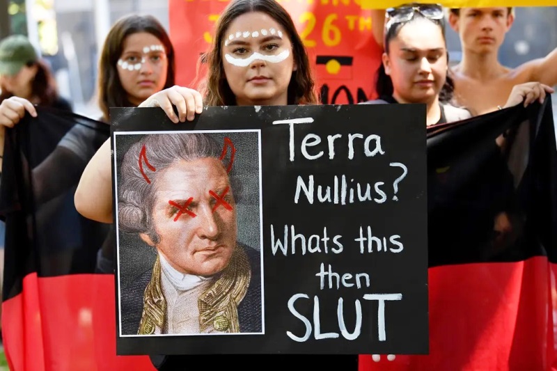 Una manifestante sostiene la imagen del capitán Arthur Phillip, con una frase peyorativa hacia quien el 26 de enero de 1778 izó la bandera británica en Sydney y declaró a Australia: “Terra Nullius” (Tierra de nadie). Desde ese momento el pueblo aborigen fue forzado a exiliarse en el interior del país y hacer frente a la violencia indiscriminada. Miles de australianos protestaron este jueves contra el feriado nacional del “Día de Australia”, que marca el aniversario del desembarco de la flota británica. La fecha es conocida también con otro nombre que expresa un fuerte sentido de rechazo: “Día de la Invasión”, debido al impacto devastador que tuvo el colonialismo y su legado racista en los pueblos originarios que habían vivido en el territorio durante decenas de miles de años antes de la llegada de los británicos. Las multitudinarias marchas de ayer buscan cambiar el día festivo del 26 de enero, o abolirlo por completo.