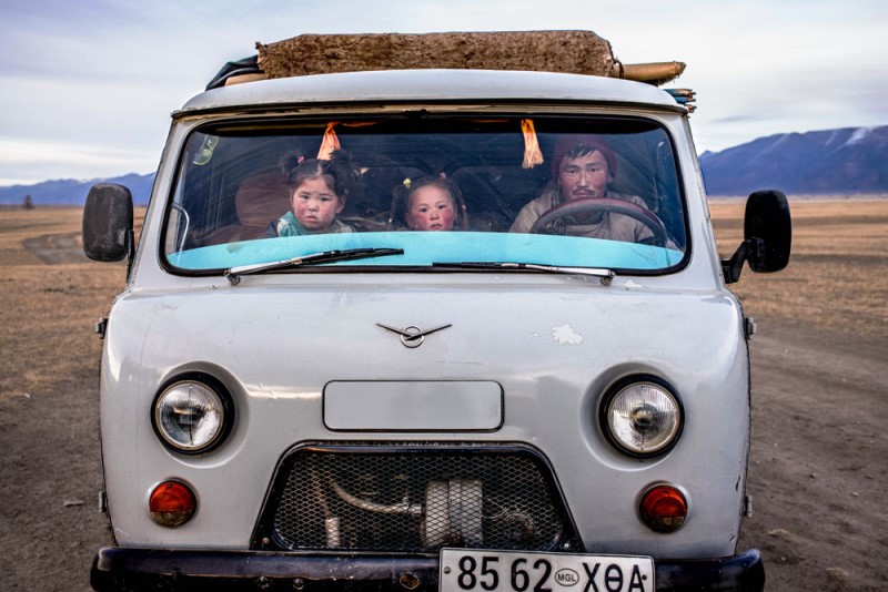 Una familia nómada del valle de Darhad, Mongolia, comienzan a moverse para sobrevivir con su ganado. Con veranos calurosos e inviernos helados, Mongolia tiene uno de los climas más extremos de la Tierra. También figura entre las naciones con menos densidad de población. En las vastas estepas que se extienden a lo largo del norte de Mongolia, kilómetros separan a los “gers” (carpas familiares) unos de otros, los cuales son trasladados al menos cuatro veces al año, conforme a las estaciones. Miles de pastores en los últimos años han abandonado la vida nómada para vivir en la ciudad. Los grupos familiares se amontonan en asentamientos, que crecen de forma descontrolada, en las orillas de Ulán Bator, la capital del país, cuya población se ha duplicado en las últimas dos décadas. Este padre y sus hijas han decidido permanecer en la estepa y aunque hay un brillo triste y como de cansancio en sus ojos, no miran atrás.
