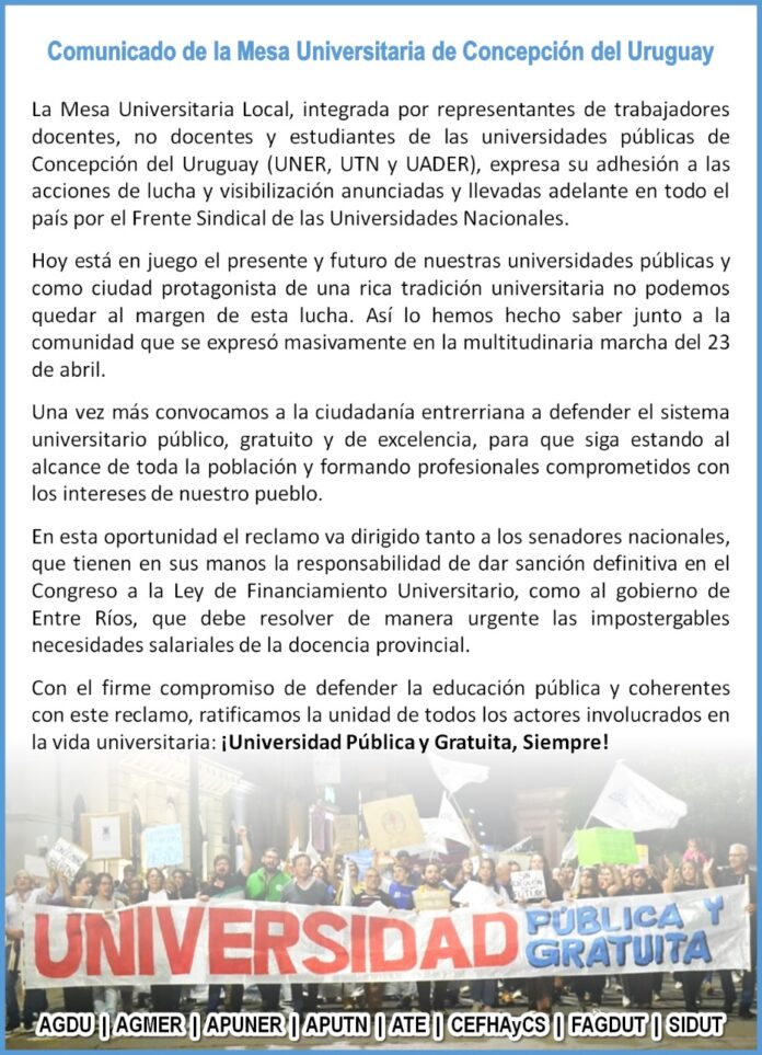 Bajo la consigna: ‘¡Universidad pública y gratuita, siempre!, la Mesa Universitaria de Concepción del Uruguay, integrada por representantes de los docentes, no docentes y estudiantes de las universidades públicas –Autónoma de Entre Ríos (Uader), Nacional de Entre Ríos (UNER) y Tecnológica Nacional (UTN)- expresó su adhesión a las acciones de lucha y visibilización anunciadas y llevadas adelante en todo el país por el Frente Sindical de las Universidades Nacionales.