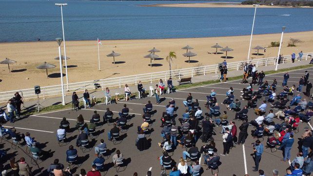 La organización del acto en la Isla del Puerto fue cuidada en todos sus detalles desde el punto que más cuestionamientos podría llegar a recibir: el sanitario. Se realizó en un espacio abierto, hubo distanciamiento entre las sillas dispuestas para el público y el uso de barbijos fue generalizado.