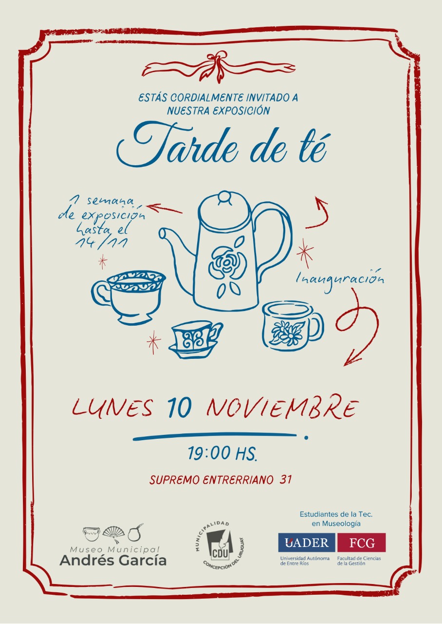 Estudiantes del segundo año de la Tecnicatura en Museología invitan a la comunidad a participar de una «Tarde de té» diferente, que servirá como acto inaugural de la muestra que constituye su proyecto final de cursada de la cátedra de Documentación, dictada por la profesora Mariela Martínez. El evento tendrá lugar este lunes 10 de noviembre en el Museo Andrés García, ubicado en Supremo Entrerriano 31.