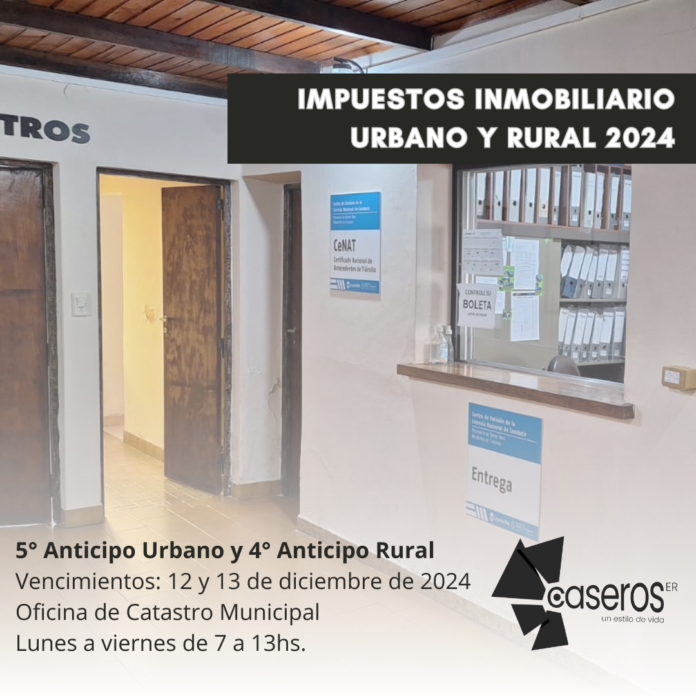 En la oficina de Catastro Municipal se encuentran para retirar las boletas correspondientes al 5° anticipo del Impuesto Inmobiliario Urbano y al 4° Anticipo del Rural-Subrural 2024. Ambos impuestos tendrán como fechas de vencimiento los días 12 y 13 de diciembre de 2024.