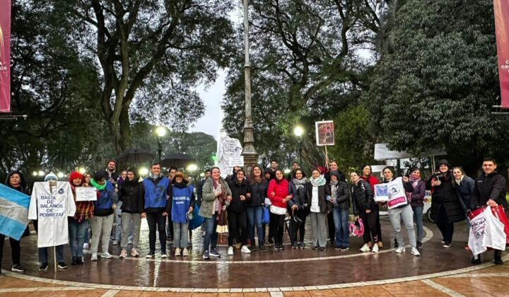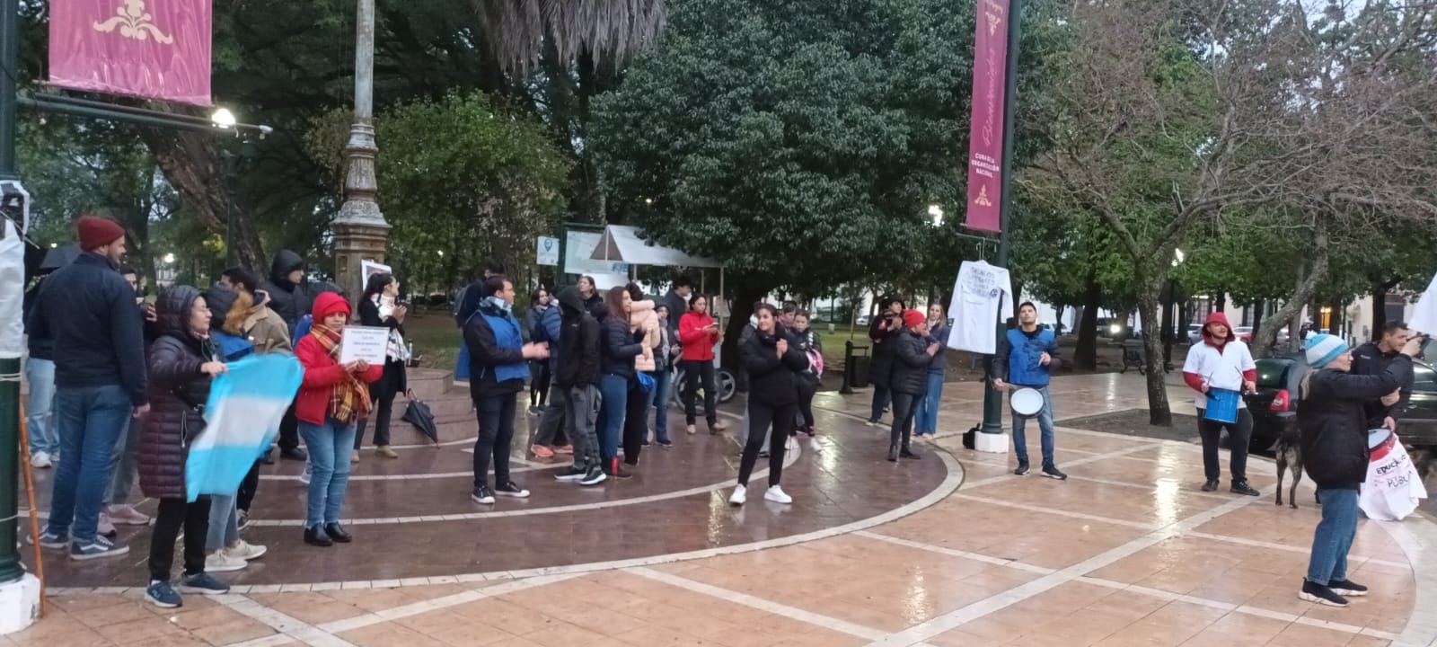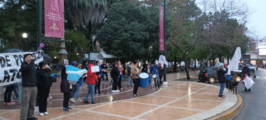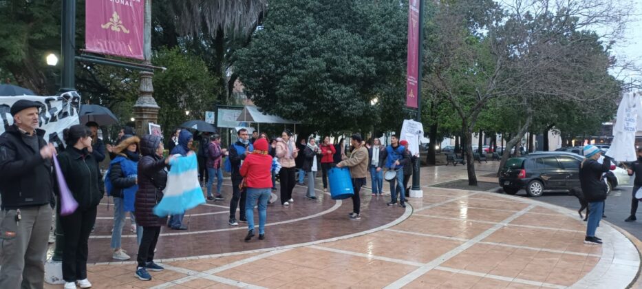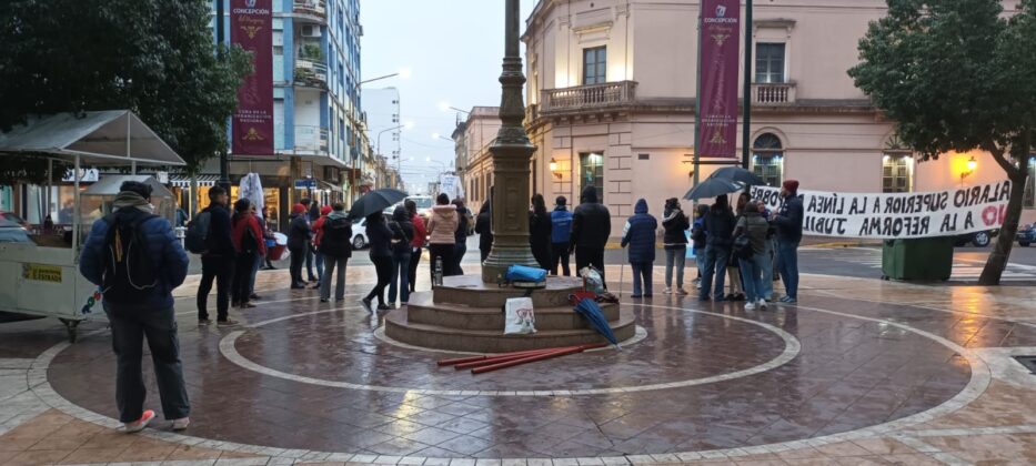 Bajo una copiosa llovizna, los docentes se manifestaron este jueves 22, en el marco del paro docente y ruidazo, en la plaza General Francisco Ramírez, en rechazo a la conciliación obligatoria, dispuesta por la Justicia laboral en respuesta al pedido del gobernador Rogelio Frigerio. “Basta de salarios de pobreza, abajo la reforma jubilatoria y no a la esencialidad educativa”, sostuvieron los trabajadores de la educación.