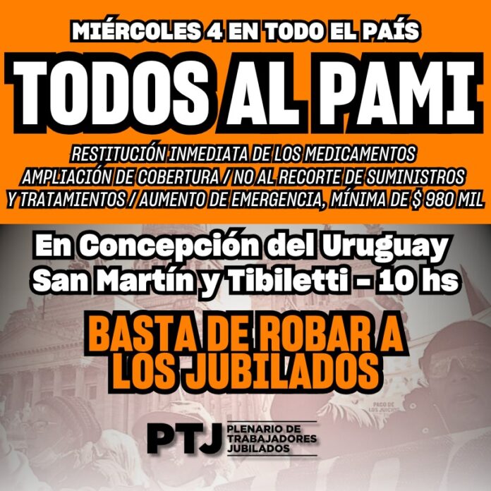 Bajo el lema: ‘Con los jubilados no, Milei’, el Plenario de Trabajadores Jubilados (PTJ) de Concepción del Uruguay adherirá a la medida nacional de trasladarse este miércoles 4, a las 10:00, hasta la oficina del Programa de Atención Médica Integral (PAMI) por manifestar su rechazo a la decisión de suprimir el descuento del 100% a la totalidad de los medicamentos que otorgaba la obra social a los jubilados y pensionados.