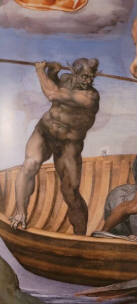 La mirada de Ganímedes no es la de un secuestro ni tampoco la misma de Caronte. Aquel demonio con ojos de fuego del que hablaba Dante. El hosco barquero que describió Virgilio. Los críticos de arte siempre han coincidido que Miguel Ángel retrató el rostro, el cuerpo, la barca y la misma mirada que describieron los poetas. Su mirada es intensa pero también desconcierta como la de Ganímedes. Es profundamente humana. Detrás de Caronte, ya lo decía Ascano Condivi, Miguel Ángel pintó la profecía de Ezequiel: “…Yo les voy a infundir espíritu para que vivan. Les injertaré tendones, les haré crecer carne; tensaré sobre ustedes la piel y les infundiré espíritu para que revivan. Así sabrán que soy el Señor…” (Ezequiel, 37). Por ello, la relectura del mismo libro que leyó Miguel Ángel para pintar tantos metros del Juicio Final nos permite ver a Caronte de otra forma. Ya no como un demonio con ojos de fuego sino con la mirada estricta pero indulgente del Dios que habló con Israel por boca de Ezequiel: “…Arrepiéntanse y conviértanse de sus delitos, y no caerán en pecado. Quítense de encima los delitos que han cometido y estrenen un corazón nuevo y un espíritu nuevo y así no morirán. Porque yo no quiero la muerte de nadie. ¡Conviértanse y vivirán!” (Ezequiel 18, 30). “¡Por mi vida, juro que no quiero la muerte del malvado, sino que cambie de conducta y viva. Conviértanse, cambien de conducta, malvados y no morirán!” (Ezequiel, 33, 11). Cuanto más leo sobre Caronte, más me convenzo del alma pía detrás de su mirada. La lucha por la vida la enfrentamos con la ilusión de la vida después de la muerte y a él, hijo menor de la Oscuridad y de la Noche, le tocó ser el guía sobre las aguas del Estigia.