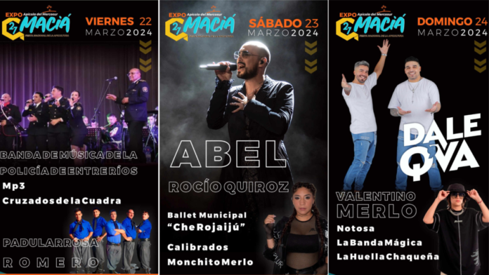 Este viernes 23 se presentarán: La Banda de la Policía de Entre Ríos, MP3, Padularrosa Romero y Cruzados de la Cuadra. Este sábado 23: La apertura del evento estará a cargo del Ballet Municipal Che Rojaijú y, a continuación, estarán Calibrados, Monchito Merlo, Rocío Quiroz y Abel Pintos. En tanto que este domingo 24 participarán: La banda de rock local Notosa, luego La Banda Mágica, La Huella Chaqueña, Valentino Merlo y el gran cierre a cargo de Dale Q’ Va.