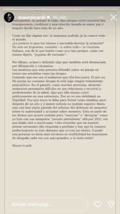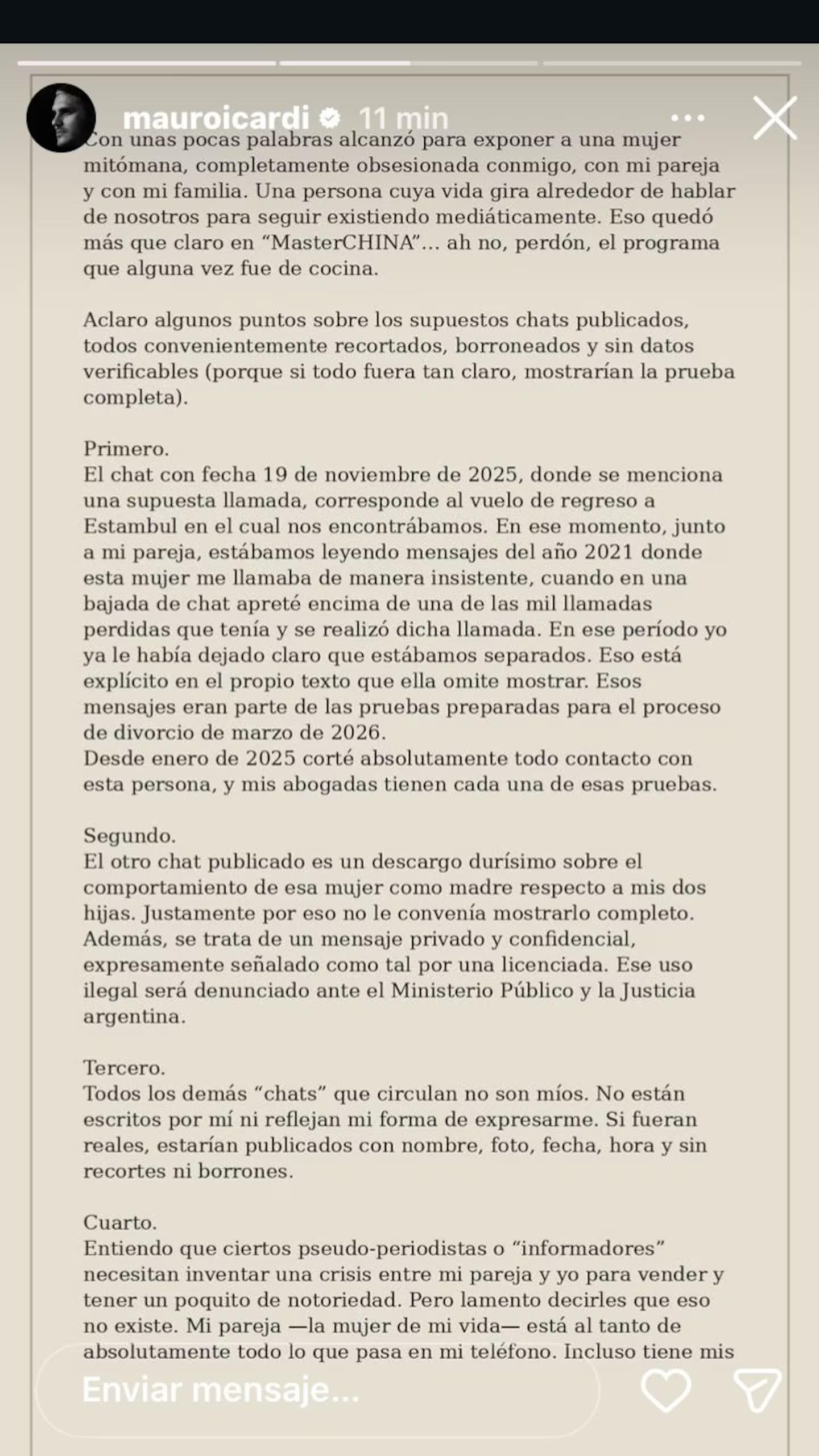 En el texto, Icardi afirmó que los chats publicados fueron «convenientemente recortados, borroneados y sin datos verificables». Explicó que uno de los mensajes mencionados, fechado el 19 de noviembre de 2025, corresponde a una llamada accidental realizada durante un vuelo a Estambul mientras revisaba, junto a su actual pareja, conversaciones antiguas de 2021, las cuales forman parte de las pruebas para su proceso de divorcio previsto para marzo de 2026.