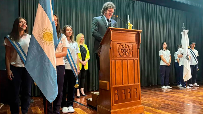 Tras recibir distinciones por parte de las autoridades del colegio, Milei dio un discurso que se extendió durante una hora y cuatro minutos, e incluyó un par de preguntas de alumnos.