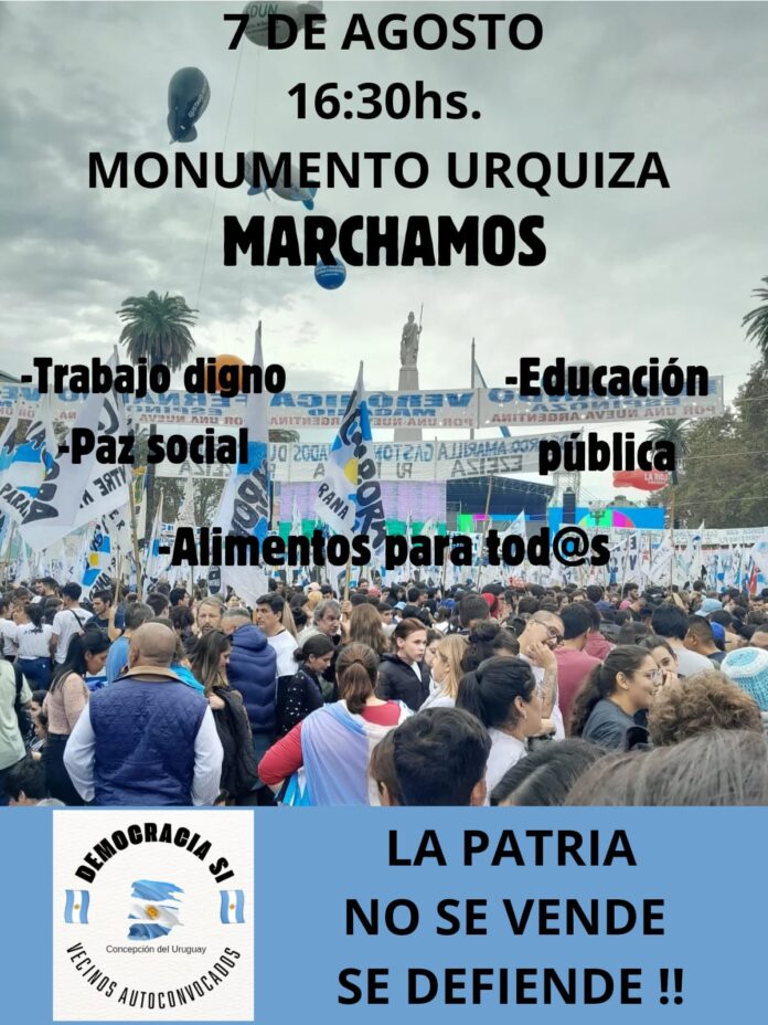 Los vecinos autoconvocados de Democracia Sí anunciaron que este miércoles 7, a las 16:30, se congregarán en el Monumento a Urquiza para marchar desde allí por trabajo digno, paz social, educación pública y alimentos para todos. Será bajo el lema: ‘La patria no se vende, se defiende’.