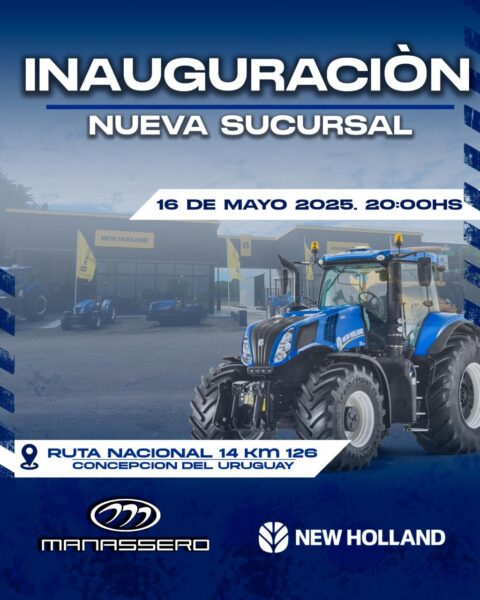 Este viernes 16 de mayo a las 20:00 horas, la firma Manassero inaugurará oficialmente su nueva sucursal ubicada en Ruta Nacional 14 Km 126, en Concepción del Uruguay. El evento marca un hito importante para el desarrollo agroindustrial de la región, consolidando la presencia de la marca New Holland en el territorio.