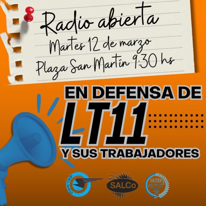Será para decir no al cierre de la agencia de noticias Télam y en defensa de LT11, los medios públicos y sus trabajadores, la reincorporación inmediata de las y los contratados, la apertura de paritarias, los básicos por encima de la línea de pobreza, un aumento del 100% en todos los básicos, la cláusula gatillo automática mes a mes ajustada a la inflación, no a la intervención, el rechazo a la violación de los convenios y asambleas en todas las emisoras de la Argentina.