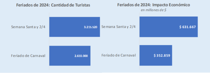El feriado XXL que combinó Semana Santa con el Día del Veterano y los Caídos en Malvinas fue muy bueno para el sector turístico. Viajaron 3,2 millones de personas en los seis días que duró el fin de semana y gastaron $631.667 millones en alimentos, bebidas, alojamiento, transporte, recreación y compras diversas.