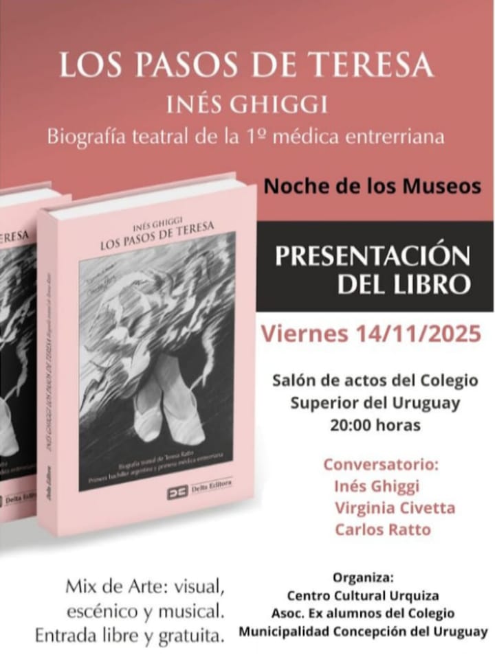 Este viernes 14 de noviembre, a las 20:00, se presentará el libro “Los pasos de Teresa”, de la escritora Inés Ghiggi, en el Salón de Actos del Colegio del Uruguay “Justo José de Urquiza”, un lugar profundamente ligado a la vida académica de la médica uruguayense.