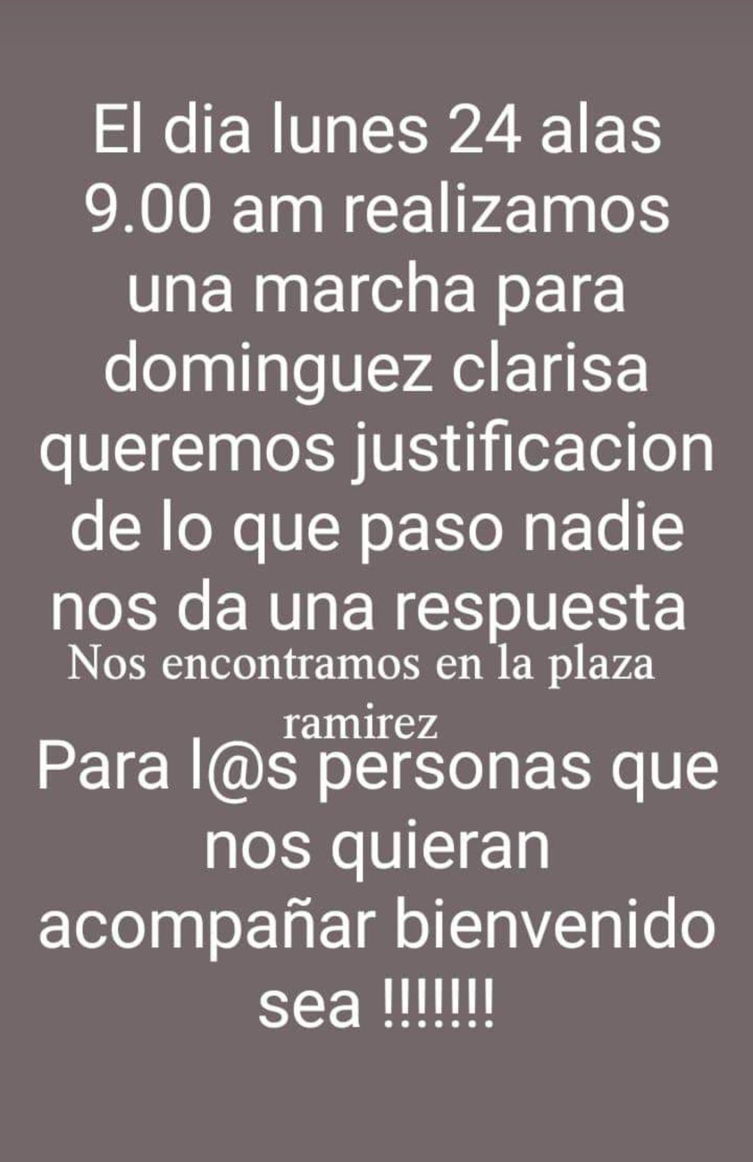 Hoy a partir de las 9 de la mañana, llevarán a cabo una marcha en plaza General Francisco Ramírez, porque quieren «una justificación de lo que pasó porque nadie nos da una respuesta», detallan en la imagen que hicieron circular por las redes sociales. Su familia y amistades declaran que Clarisa no quiso incendiarse ni suicidarse, que su pareja es el responsable.