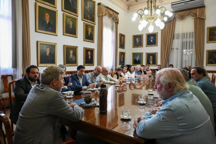 El encuentro se realizó en el Salón de los Gobernadores de Casa de Gobierno y contó con la participación del secretario General de la Gobernación, Mauricio Colello; los ministros de Gobierno y Trabajo, Manuel Troncoso, y de Economía y Servicios Públicos, Fabián Boleas; el presidente de la Caja de Jubilaciones y Pensiones de la provincia, Gastón Bagnat; y el secretario de Trabajo, Mariano Camoirano.