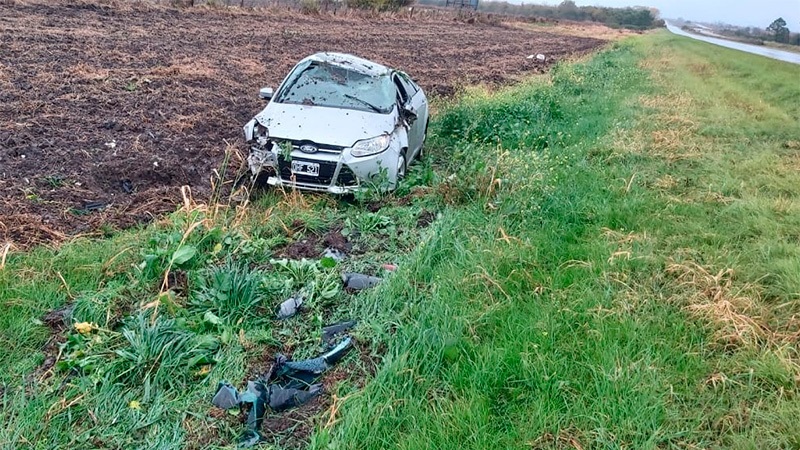 La mujer de 50 años, conducía su auto Ford Focus acompañada por su esposo de 55, cuando perdió el control del vehículo al pasar por un espejo de agua en la Ruta N°18, a casi tres kms de Viale.