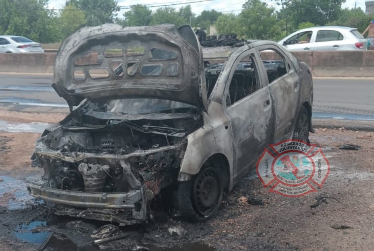 El vehículo, un Chevrolet interno 1220, fue consumido completamente por las llamas, a pesar del accionar de los Bomberos Voluntarios que intentaron sofocar el fuego.