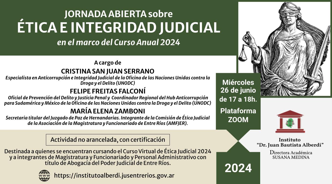 Quienes deseen participar deberán inscribirse en https://institutoalberdi.jusentrerios.gov.ar/events/jornada-abierta-sobre-etica-e-integridad-judicial/ , aunque esté cursando el Curso Virtual de Ética Judicial – Edición 2024.