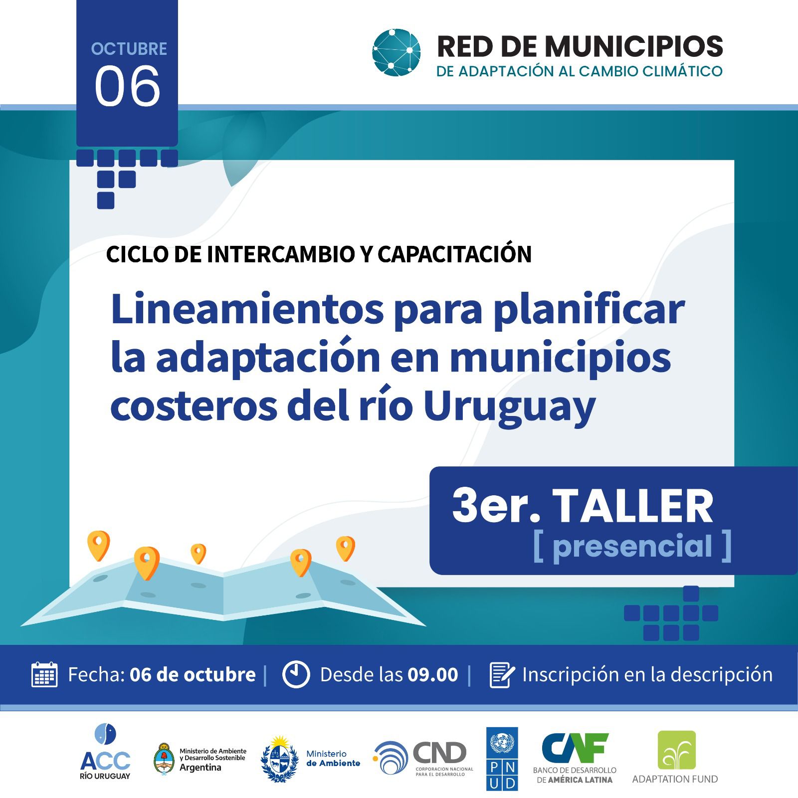 El viernes 6 de octubre, se realizará el tercer taller del Ciclo de intercambio y capacitación sobre Análisis de riesgos y opciones de adaptación al cambio climático del que participan los municipios situados a la margen del río Uruguay, conjuntamente con autoridades nacionales tanto de Argentina, como de Uruguay. La participación es abierta al público y a las instituciones interesadas en la preservación del hábitat.