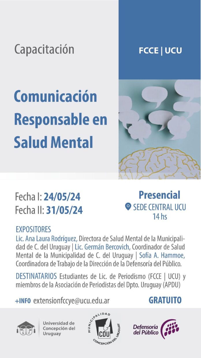La Facultad de Ciencias de la Comunicación y de la Educación junto a la Municipalidad de Concepción del Uruguay y la Defensoría del Público llevarán adelante la capacitación «Comunicación Responsable en Salud Mental». Serán dos encuentros: el primero el 24/5 y el segundo el 31/5, ambos a las 14:00, en 8 de Junio 522 y virtual.