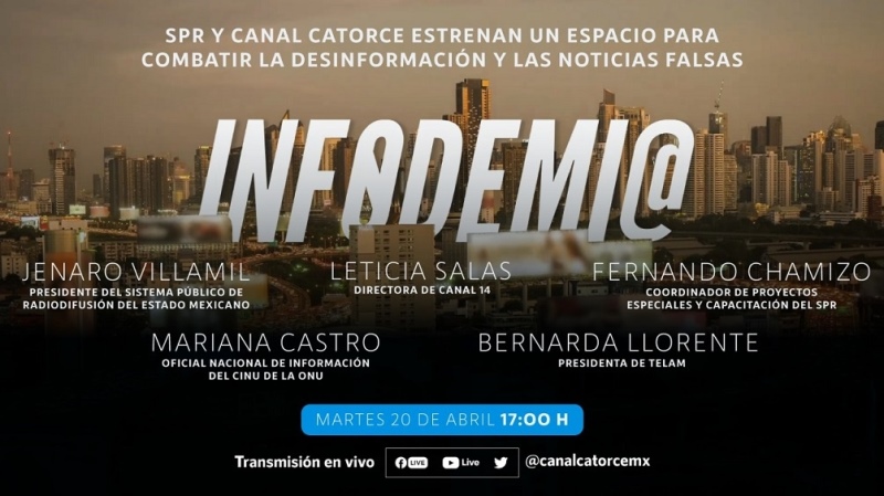 El Sistema Público de Radiodifusión del Estado Mexicano (SPR) estrenará hoy, a las 23:30 (hora argentina), Infodemia, un programa multiplataforma que alerta sobre las noticias falsas, la desinformación y la infodemia, que cuenta con la participación de Télam a partir del convenio de coproducción e intercambio de contenidos que suscribió la agencia pública de noticias con el conglomerado informativo del país latinoamericano. La presentación de Infodemia será transmitida a las 19:00 (hora argentina), a través del sitio web de Télam y del Facebook Live y YouTube Live de Canal Catorce, de México. Estarán presentes en esa presentación Jenaro Villamil, presidente del SPR; su par en Télam, Bernarda Llorente; Mariana Castro Álvarez, Oficial Nacional de Información del Centro de Información de las Naciones Unidas en México (CINU México); y el conductor de la serie, Miguel Elorza, reflexionan sobre cómo combatir las noticias falsas.