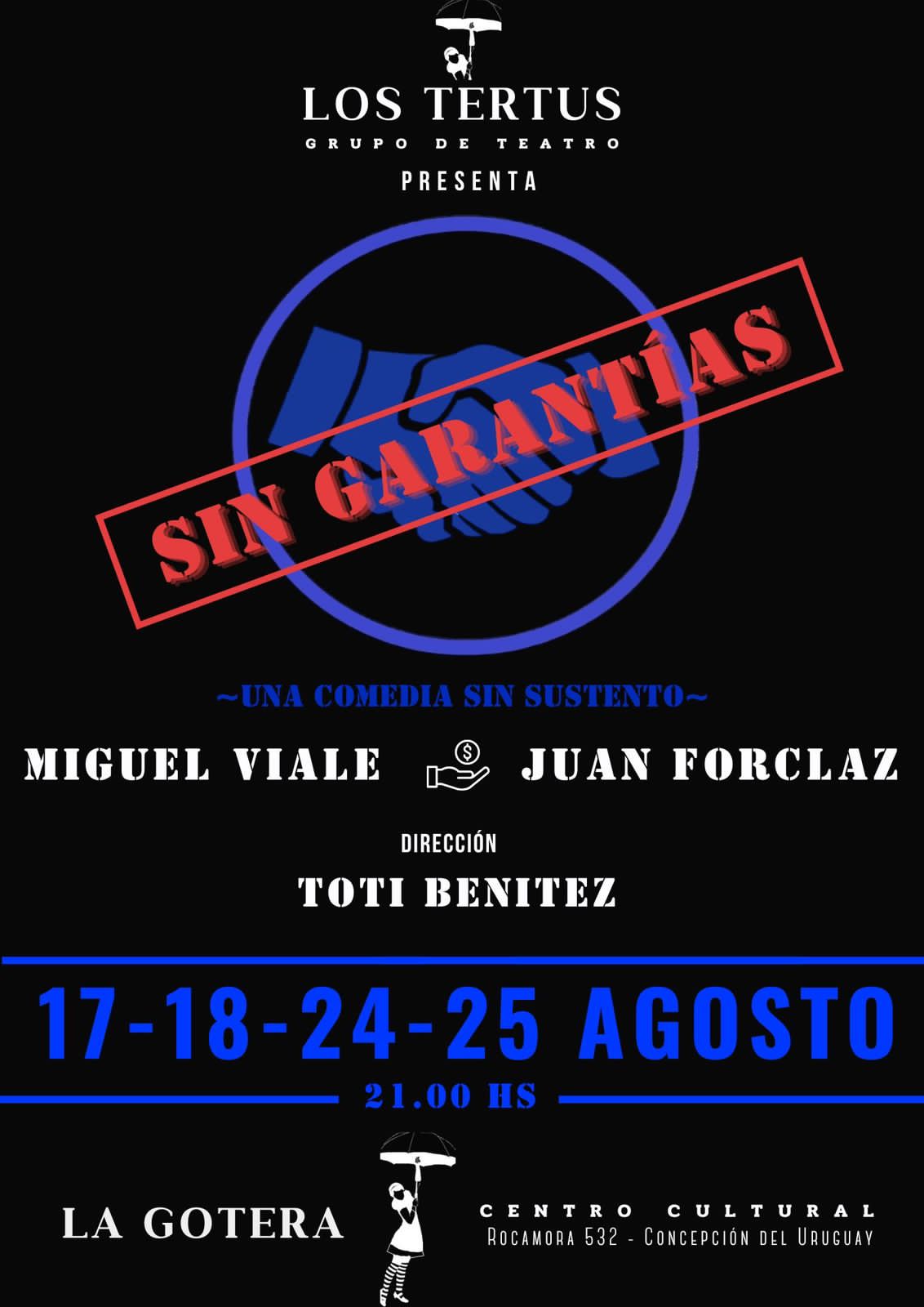 En el Centro Cultural La Gotera se estrenará el 17, 18, 24 y 25 de agosto, a las 21:00, la obra ‘Sin Garantías, una comedia sin sustento’, con la actuación de Migue Viale y Juan Forclaz, bajo la dirección de Toti Benítez.