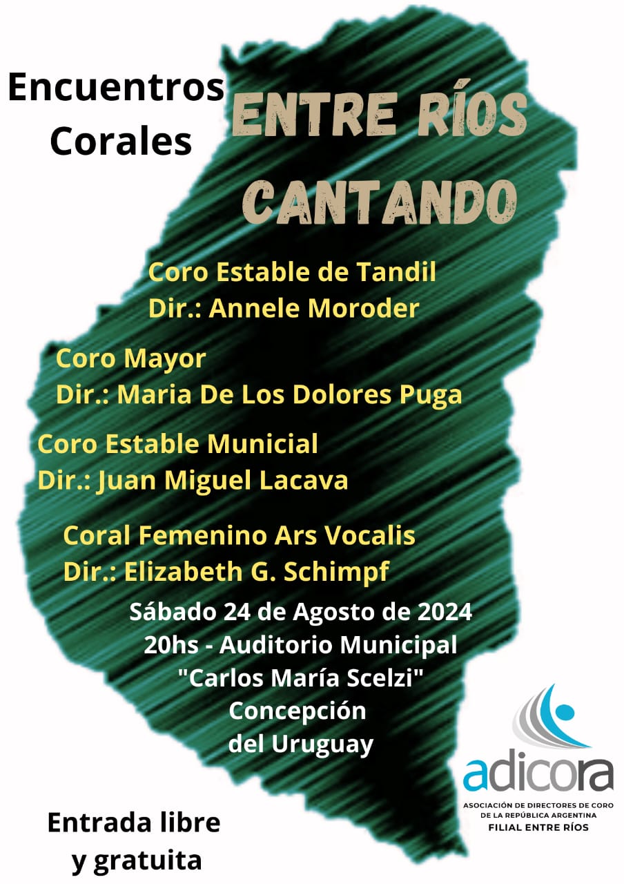 En el auditorio Carlos María Scelzi se llevará a cabo este sábado 24, a las 20:00, el encuentro coral Entre Ríos Cantando, organizado por la Asociación de Directores de Coros – Filial Entre Ríos (Adicoer).