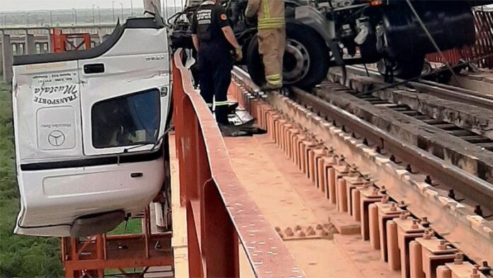 Aparentemente, el chófer perdió el control del camión y, al intentar realizar una maniobra para estabilizarlo, se fue contra el guarda raíl lo choca y termina volcado colgando del puente.