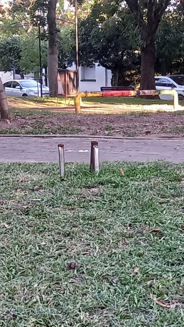 En el sector de césped han quedado expuestos dos o tres caños metálicos, aparentemente por lo que a mi me parece restos de antiguos tutores de árboles u otra estructura ya retirada. Lo cierto es que hoy se encuentran a la intemperie, cortados de manera irregular, con bordes punteagudos y signos visibles de óxido. Representan un riesgo concreto y evitable.
