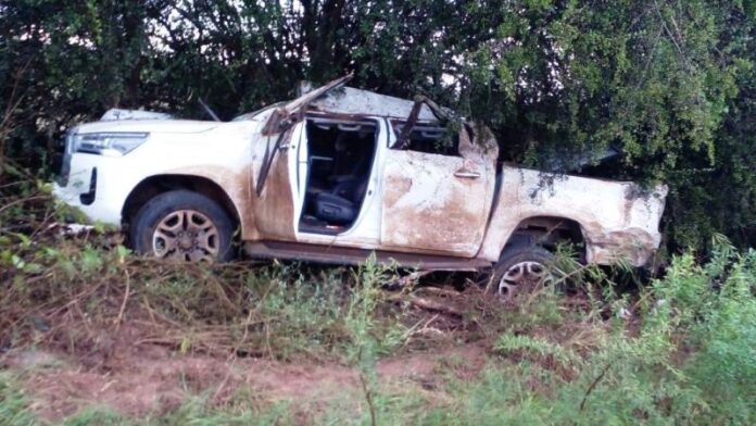 Tras el impacto, el Renault Logan quedó «colgado» en la banquina, pero no volcó. En cambio, la camioneta se desplazó hacia la banquina y chocó contra una cortina de árboles, dejando al conductor atrapado en su interior.