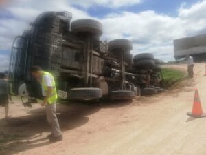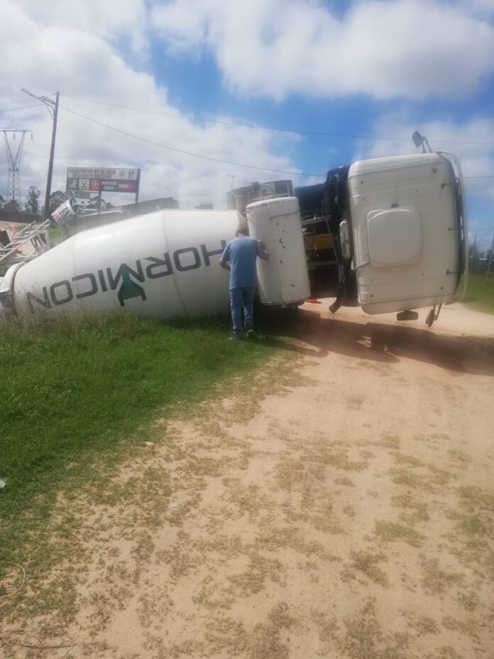 Un camión hormigonero realizó una maniobra indebida y terminó cayendo en una zanja profunda que está al costa del acceso J:J. Bruno. Pese a la espectacularidad de las imágenes, no se registraron heridos.