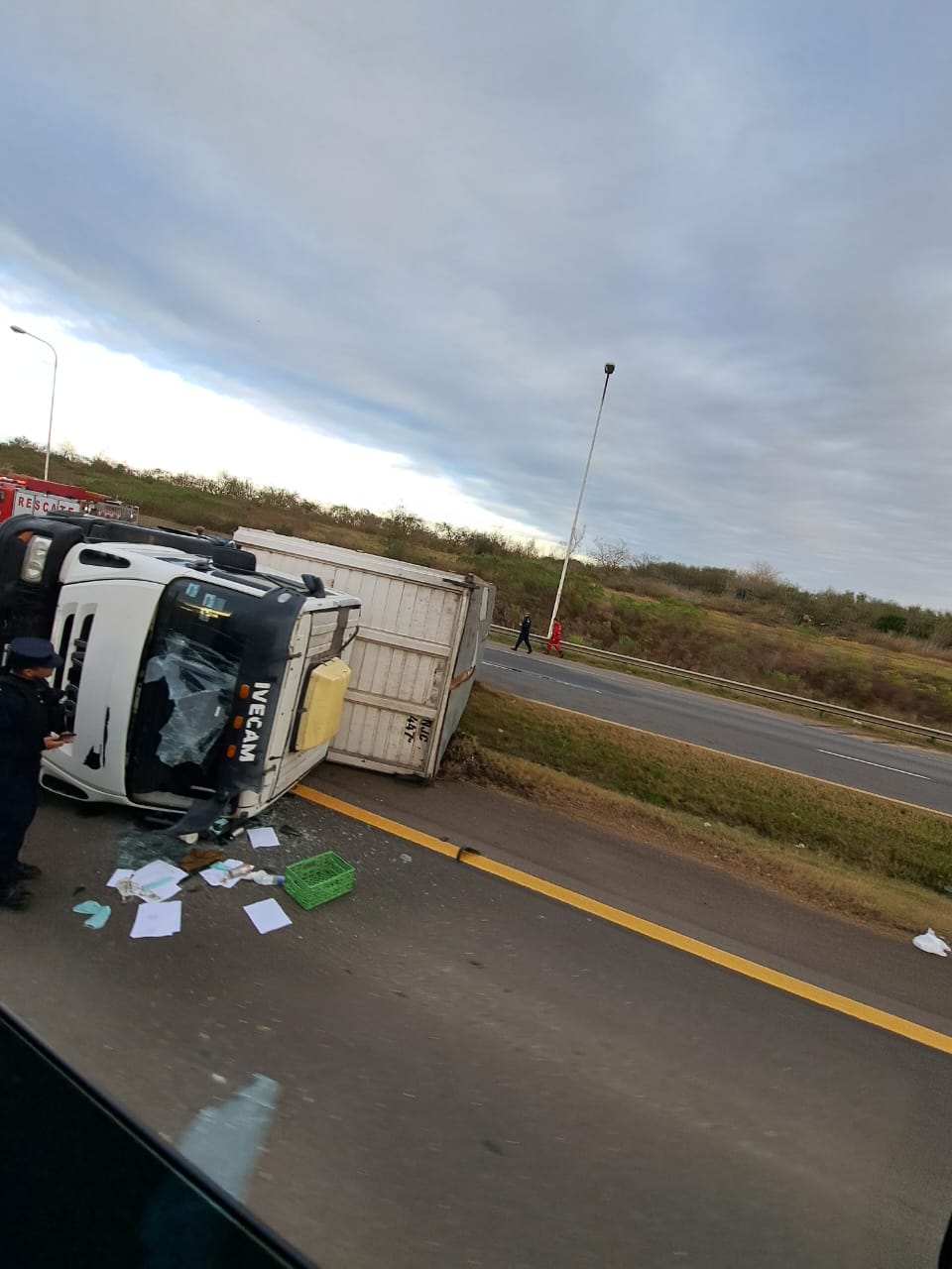 Sale de inmediato móvil 15 (Rescate) con personal y al arribo se observa que era un vuelco de un camión de cargas generales marca Iveco, cuyo conductor (por causas que se trataban de establecer) perdió el control y terminó volcando sobre el cantero central», informaron.